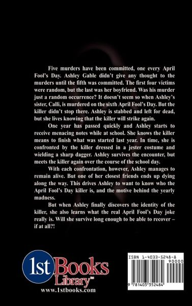 Ashley didn't care about the April Fool murders, until her sister became the latest. Next year, the killer confronts her. She survives, but a friend dies and Ashley pursues the killer until she discovers the real joke.