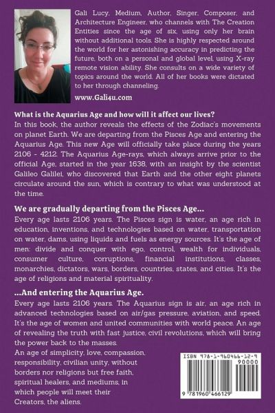 What is the Aquarius Age and how will it affect our lives? In this book, the author reveals the effects of the Zodiac's movements on planet Earth. We are departing from the Pisces Age and entering the Aquarius Age. This new Age will officially take place during the years 2106 - 4212. The Aquarius Age-rays, which always arrive prior to the official Age, started in the year 1638, with an insight by the scientist Galileo Galilei, who discovered that Earth and the other eight planets circulate around the sun, which is contrary to what was understood at the time. We are gradually departing from the Pisces Age... Every age lasts 2106 years. The Pisces sign is water, an age rich in education, inventions, and technologies based on water, transportation on water, dams, using liquids and fuels as energy sources. It's the age of men: divide and conquer with ego, control, wealth for individuals, consumer culture, corruptions, financial institutions, classes, monarchies, dictators, wars, borders, countries, states, and cities. It's the age of religions and material spirituality. ...And entering the Aquarius Age. Every age lasts 2106 years. The Aquarius sign is air, an age rich in advanced technologies based on air/gas pressure, aviation, and speed. It's the age of women and united communities with world peace. An age of revealing the truth with fast justice, civil revolutions, which will bring the power back to the masses. An age of simplicity, love, compassion, responsibility, civilian unity, without borders nor religions but free faith, spiritual healers, and mediums, in which people will meet their Creators, the aliens. ¿¿The Aquarius Age is book #2 in the Gali Lucy Predictions Series: Book #1: Divine Creation. Book #2: The Aquarius Age. Book #3: The Future: Based on the Ages theory. Book #4: Messages from the Mystical Cards. Book #5: Lenormand Tarot Deck Meaning: A guidebook channeled through Anne-Marie Adelaide's spirit. Gali Lucy, Medium, Author, Singer, Composer, and Architecture Engineer, who channels with The Creation Entities since the age of six, using only her brain without additional tools. She is highly respected around the world for her astonishing accuracy in predicting the future, both on a personal and global level, using X-ray remote vision ability. She consults on a wide variety of topics around the world. All of her books were dictated to her through channeling. www.Gali4u.com