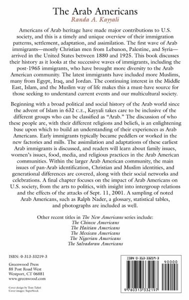 Americans of Arab heritage have made major contributions to U.S. society, and this is a timely and unique overview of their immigration patterns, settlement, adaptation, and assimilation for a general audience. The first wave of Arab immigrants, mostly Christian men from Lebanon, Palestine, and Syria, arrived in the United States between 1880 and 1925. This book discusses their history as it looks at the successive waves of immigrants, including the post-1965 immigrants, who have brought more diversity to the Arab American community. The latest immigrants have included more Muslims, many are from Egypt, Iraq, and Jordan. The continuing interest in the Middle East, Islam, and the Muslim way of life make this a must-have source for those seeking to understand current events and our multicultural society. Americans of Arab heritage have made major contributions to U.S. society, and this is a timely and unique overview of their immigration patterns, settlement, adaptation, and assimilation for a general audience. The first wave of Arab immigrants, mostly Christian men from Lebanon, Palestine, and Syria, arrived in the United States between 1880 and 1925. This book discusses their history plus looks at the successive waves of immigrants, including the post-1965 immigrants, who have brought more diversity to the Arab American community. The latest immigrants have included more Muslims and many are from Egypt, Iraq, and Jordan. The continuing interest in the Middle East, Islam, and Muslim way of life make this a must-have source to help understand current events and our multicultural society. The book begins by giving a broad political and social history of the Arab world since the advent of Islam in 632 CE. Kayyali also takes care to be inclusive of the different groups who can be classified as Arab, and the discussion of who these people are, with their different religions and beliefs, is an enlightening base to understand their experiences as Arab Americans. Early immigrants typically became peddlers or worked in the new factories and mills. As they gave up thoughts of returning to their home countries, they fought to be classified as white to gain citizenship, and the impact of the Census on their struggle is discussed in detail. Their assimilation and adaptations are discussed, and readers will learn about family issues, women's issues, food, media, and religious practices in the Arab American communities. Within the larger Arab American community, the main issues of pan-Arab identification, Christian and Muslim identities, and generational differences are covered, along with their social networks and celebrations. A final chapter focuses on the impact of Arab Americans on U.S. society, from the arts to politics, with insight into intergroup relations and the impact of 9/11. A sampling of noted Arab Americans, such as Ralph Nader, a glossary, statistical tables, and photos are included as well.