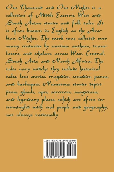 One Thousand and One Nights is a collection of Middle Eastern, West and South Asian stories and folk tales. It is often known in English as the Arabian Nights. The work was collected over many centuries by various authors, translators, and scholars across West, Central, South Asia and North Africa. The tales vary widely: they include historical tales, love stories, tragedies, comedies, poems, and burlesques. Numerous stories depict jinns, ghouls, apes, sorcerers, magicians, and legendary places, which are often intermingled with real people and geography, not always rationally
