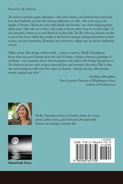 The Arborists studies paper ephemera-the notes, letters, and artwork that particular lives leave behind; and also the sensory ephemera of a life-the taste of pie, the depths of flowers. The book visits with family and friends, "our chairs blipping their white seats / like tabs on a chart," and wants to know what "map we would make / if you attached a flame to us and filmed us in the dark." In The Arborists, hornets eat the wood of the house while the people in the house continue making themselves as best as they can into mattering. Moments and memories collage into an elusive definition of love. "Rilke wrote, 'The things of this world... seem to need us.' Molly Tenenbaum, better than any poet I know, hears the call of things-banjos, clematis, paintings of chickens-and translates for us their happiness and pathos. She brings this genius to The Arborists, set in a time of great personal loss and romantic discovery. This is that rare and wondrous collection that takes my breath-deeply moving, effervescent, utterly original and alive." -Kathleen Flenniken, Poet Laureate Emerita of Washington State, author of Post Romantic ¿¿"Tenenbaum's poems are lyrical, tightly woven, at times whimsical. They are powerful poems of a mother's passing, of a brother's face, of a dad's collapse. The natural world of vines, trees, flowers, pawed creatures is strongly present, as is domestic life, and the poet's life as a banjo player and teacher. In this work images are stacked, stitched, and intertwined, making each poem a mesmerizing read, a piece of music." -Priscilla Long, author of Holy Magic and Crossing Over: Poems "With a deep, underlying music, the poems in The Arborists reflect the world's detail. Tenenbaum calls hornets 'little cartographers,' writes a biography in banjo, and remembers 'how we used to lose our nozzles.' This is a world to be richly lost in-where a friend says, 'Can I quit my job yesterday?' and the cat is a 'weather report.' The Arborists asks what to do with the artifacts of a life, and answers: Craft them into poems." -Kelli Russell Agodon, author of Dialogues with Rising Tides