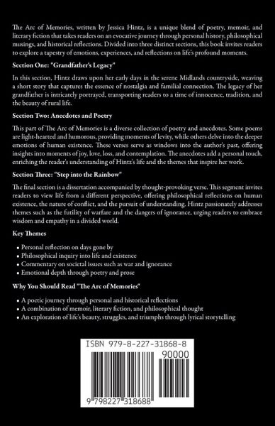 The Arc of Memories, written by Jessica Hintz, is a unique blend of poetry, memoir, and literary fiction that takes readers on an evocative journey through personal history, philosophical musings, and historical reflections. Divided into three distinct sections, this book invites readers to explore a tapestry of emotions, experiences, and reflections on life's profound moments. Section One: "Grandfather's Legacy" In this section, Hintz draws upon her early days in the serene Midlands countryside, weaving a short story that captures the essence of nostalgia and familial connection. The legacy of her grandfather is intricately portrayed, transporting readers to a time of innocence, tradition, and the beauty of rural life. Section Two: Anecdotes and Poetry This part of The Arc of Memories is a diverse collection of poetry and anecdotes. Some poems are light-hearted and humorous, providing moments of levity, while others delve into the deeper emotions of human existence. These verses serve as windows into the author's past, offering insights into moments of joy, love, loss, and contemplation. The anecdotes add a personal touch, enriching the reader's understanding of Hintz's life and the themes that inspire her work. Section Three: "Step into the Rainbow" The final section is a dissertation accompanied by thought-provoking verse. This segment invites readers to view life from a different perspective, offering philosophical reflections on human existence, the nature of conflict, and the pursuit of understanding. Hintz passionately addresses themes such as the futility of warfare and the dangers of ignorance, urging readers to embrace wisdom and empathy in a divided world. Key ThemesPersonal reflection on days gone by Philosophical inquiry into life and existence Commentary on societal issues such as war and ignorance Emotional depth through poetry and prose Why You Should Read "The Arc of Memories"A poetic journey through personal and historical reflections A combination of memoir, literary fiction, and philosophical thought An exploration of life's beauty, struggles, and triumphs through lyrical storytelling