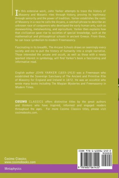 In this extensive work, John Yarker attempts to trace the history of Masonry and Masonic rites through history, proving its legitimacy through seniority and the power of tradition. Yarker establishes the roots of Masonry in a race he calls the Aryans, a catchall phrase to describe an unknown race of conquerors who developed the early human arts, such as stoneworking, metalworking, and agriculture. Yarker then explains how that civilization gave rise to societies of special knowledge, such at the mathematical and philosophical schools in ancient Greece. From these, he can trace symbolism to modern Freemasonry. Fascinating in its breadth, The Arcane Schools draws on seemingly every society and era to pull the history of humanity into a single narrative. Those interested the arcane and occult, as well as those with a newly sparked interest in symbology, will find Yarker's book a fascinating and informative read. English author JOHN YARKER (1833-1913) was a Freemason who established the Sovereign Sanctuary of The Ancient and Primitive Rite of Masonry for England and Ireland in 1872. He was an occultist who wrote many books including The Magian Mysteries and Freemasonry in Modern Times.