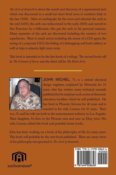 The Arch of Aramoth is about the search and discovery of a supernatural arch which was discovered in a small but short lived town in northern Italy in the late 1500's. After an earthquake hit the town and reburied the arch in the mid 1600's, the arch was rediscovered in the early 2000's and moved to San Francisco by a billionaire who put the arch in his personal museum. Many mysteries of the arch are discovered including the creation of two superheroes. There is much action including the rescue of a CIA agent, the saving of a corporate CEO, the foiling of a kidnapping and bank robbery as well as trips to planets, light years away. This book is intended to be the first book of a trilogy. The second book will be The Column of Serese and the third will be The Black Arch.