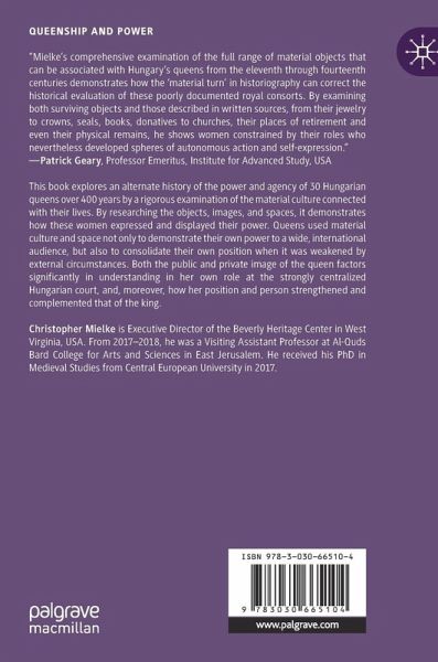 This book explores an alternate history of the power and agency of 30 Hungarian queens over 400 years by a rigorous examination of the material culture connected with their lives. By researching the objects, images, and spaces, it demonstrates how these women expressed and displayed their power. Queens used material culture and space not only to demonstrate their own power to a wide, international audience, but also to consolidate their own position when it was weakened by external circumstances. Both the public and private image of the queen factors significantly in understanding in her own role at the strongly centralized Hungarian court, and, moreover, how her position and person strengthened and complemented that of the king.