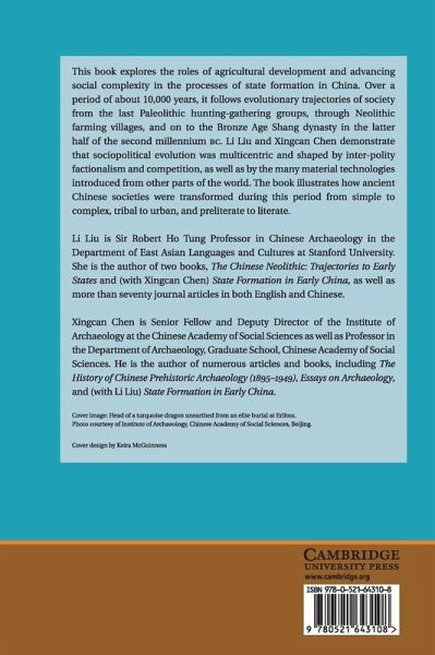 This book explores the roles of agricultural development and advancing social complexity in the processes of state formation in China. Over a period of about 10,000 years, it follows evolutionary trajectories of society from the last Palaeolithic hunting-gathering groups, through Neolithic farming villages and on to the Bronze Age Shang dynasty in the latter half of the second millennium BC. Li Liu and Xingcan Chen demonstrate that sociopolitical evolution was multicentric and shaped by inter-polity factionalism and competition, as well as by the many material technologies introduced from other parts of the world. The book illustrates how ancient Chinese societies were transformed during this period from simple to complex, tribal to urban, and preliterate to literate.
