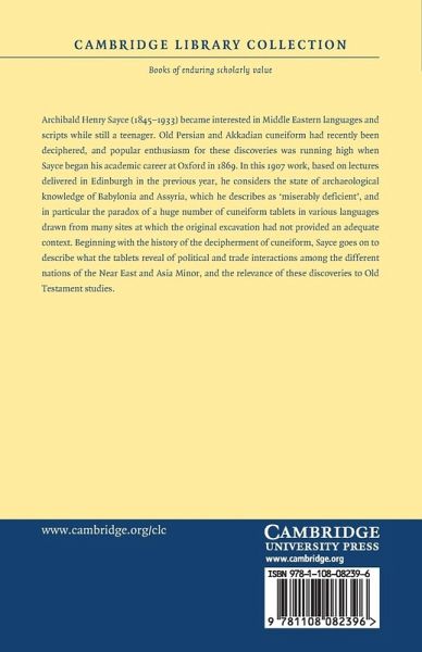 Archibald Henry Sayce (1845-1933) became interested in Middle Eastern languages and scripts while still a teenager. Old Persian and Akkadian cuneiform had recently been deciphered, and popular enthusiasm for these discoveries was running high when Sayce began his academic career at Oxford in 1869. In this 1907 work, based on lectures delivered in Edinburgh in the previous year, he considers the state of archaeological knowledge of Babylonia and Assyria, which he describes as 'miserably deficient', and in particular the paradox of a huge number of cuneiform tablets in various languages drawn from many sites at which the original excavation had not provided an adequate context. Beginning with the history of the decipherment of cuneiform, Sayce goes on to describe what the tablets reveal of political and trade interactions among the different nations of the Near East and Asia Minor, and the relevance of these discoveries to Old Testament studies.