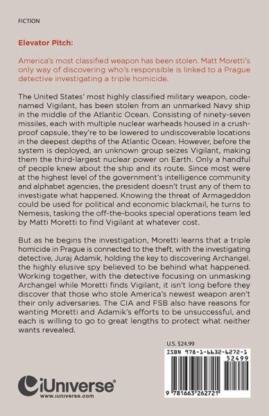 The United States' most highly classified military weapon, code-named Vigilant, has been stolen from an unmarked Navy ship in the middle of the Atlantic Ocean. Consisting of ninety-seven missiles, each with multiple nuclear warheads housed in a crush-proof capsule, they're to be lowered to undiscoverable locations in the deepest depths of the Atlantic Ocean. However, before the system is deployed, an unknown group seizes Vigilant, making them the third-largest nuclear power on Earth. Only a handful of people knew about the ship and its route. Since most were at the highest level of the government's intelligence community and alphabet agencies, the president doesn't trust any of them to investigate what happened. Knowing the threat of Armageddon could be used for political and economic blackmail, he turns to Nemesis, tasking the off-the-books special operations team led by Matti Moretti to find Vigilant at whatever cost. But as he begins the investigation, Moretti learns that a triple homicide in Prague is connected to the theft, with the investigating detective, Juraj Adamik, holding the key to discovering Archangel, the highly elusive spy believed to be behind what happened. Working together, with the detective focusing on unmasking Archangel while Moretti finds Vigilant, it isn't long before they discover that those who stole America's newest weapon aren't their only adversaries. The CIA and FSB also have reasons for wanting Moretti and Adamik's efforts to be unsuccessful, and each is willing to go to great lengths to protect what neither wants revealed.