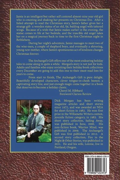 Dick Morgan has been writing magazine articles and short stories since 1972, and was awarded an NEA for short fiction in 1982. He won first prize in the Willamette Writers contest, juvenile fiction category, in 1983. His short story collection, Sailing Away, was published in June, 2000. His non-fiction book, Warrior Mind, was published in 2009. The Archangel's Gift was first published in 2012. A second story collection, Fire in the Night & Other Stories, was published in 2021. He and his wife, Lonnie, live in Portland, Oregon.