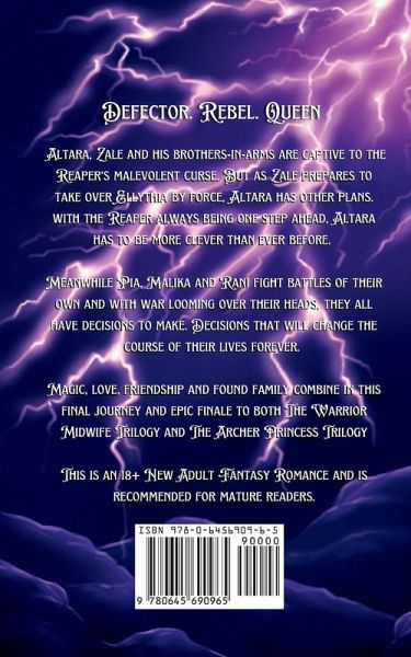 DEFECTOR. REBEL. QUEEN Altara, Zale and his brothers-in-arms are captive to the Reaper's malevolent curse. But as Zale prepares to take over Ellythia by force, Altara has other plans. But with the Reaper always being one step ahead, Altara has to be more clever than ever before. Meanwhile Pia, Malika and Rani fight battles of their own and with war looming over their heads, they all have decisions to make. Decisions that will change the course of their lives forever. Magic, love, friendship and found family combine in this final journey and epic finale to both The Warrior Midwife Trilogy and The Archer Princess Trilogy This is the final book in a New Adult M/F Trilogy where the heroine has one love interest. It is slow burn with 18+ spice. This book will finish with a HEA.
