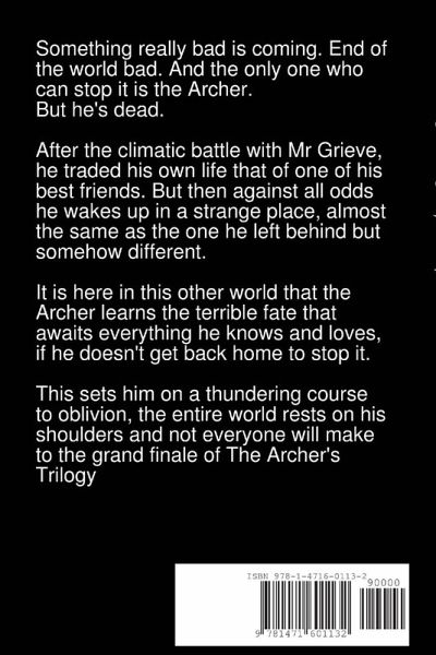 Something really bad is coming. End of the world bad. And the only one who can stop it is the Archer. But he's dead. After the climatic battle with Mr Grieve, he traded his own life that of one of his best friends. But then against all odds he wakes up in a strange place, almost the same as the one he left behind but somehow different. It is here in this other world that the Archer learns the terrible fate that awaits everything he knows and loves, if he doesn't get back home to stop it. This sets him on a thundering course to oblivion, the entire world rests on his shoulders and not everyone will make to the grand finale of The Archer's Trilogy