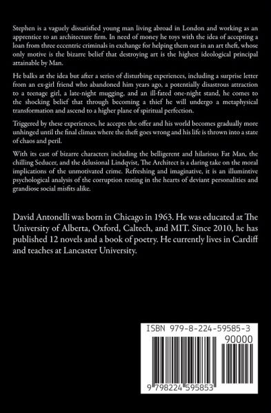 Stephen is a vaguely dissatisfied young man living abroad in London and working as an apprentice to an architecture firm. In need of money he begins to toy with the idea of accepting a loan from three eccentric criminals in exchange for helping them out in an art theft, whose only motive seems to be the bizarre belief of one of the three men, that destroying art is the highest ideological principal attainable by Man. He balks at the absurdity of this idea at first, but after a series of unusual and disturbing experiences, including a surprise letter from an ex-girl friend who abandoned him years ago, a potentially disastrous attraction to a teenage girl, a late-night mugging, and an ill-fated one-night stand, he comes to believe that through accepting the offer and becoming a thief he will undergo a metaphysical transformation and ascend to a higher plane of spiritual perfection. He accepts the offer and after this his world becomes gradually more unhinged until the climax where the theft goes wrong and his life is thrown into a state of peril. With its cast of bizarre characters including the belligerent and hilarious Fat Man, the chilling Seducer, and the delusional Lindqvist, The Architect is a daring take on the modernist obsession with unmotivated crime. Refreshing and imaginative, it brings to mind Kafka in its blend of absurd humour with an exploration of alienation and Joseph Conrad in its psychological analysis of the corruption that lies in the hearts of deviant personalities and grandiose social misfits. One reviewer on Apple Books gave The Architect 4 stars and said: "Excellent. Reminds me of Camus. A sad tale beautifully told. Looking forward to this author's future works."