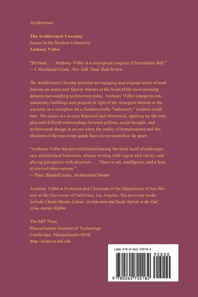 Anthony Vidler interprets contemporary buildings and projects in light of the resurgent interest in the uncanny as a metaphor for a fundamentally "unhomely" modern condition. The Architectural Uncanny presents an engaging and original series of meditations on issues and figures that are at the heart of the most pressing debates surrounding architecture today. Anthony Vidler interprets contemporary buildings and projects in light of the resurgent interest in the uncanny as a metaphor for a fundamentally "unhomely" modern condition. The essays are at once historical—serving to situate contemporary discourse in its own intellectual tradition and theoretical—opening up the complex and difficult relationships between politics, social thought, and architectural design in an era when the reality of homelessness and the idealism of the neo-avant-garde have never seemed so far apart. Vidler, one of the deftest and surest critics of the contemporary scene, explores aspects of architecture through notions of the uncanny as they have been developed in literature, philosophy, and psychology from the beginning of the nineteenth century to the present. He interprets the unsettling qualities of today's architecture—its fragmented neo-constructivist forms reminiscent of dismembered bodies, its "seeing walls" replicating the passive gaze of domestic cyborgs, its historical monuments indistinguishable from glossy reproductions - in the light of modern reflection on questions of social and individual estrangement, alienation, exile, and homelessness. Focusing on the work of architects such as Bernard Tschumi, Rem Koolhaas, Peter Eisenman, Coop Himmelblau, John Hejduk, Elizabeth Diller, and Ricardo Scofidio, as well as theorists of the urban condition, Vidler delineates the problems and paradoxes associated with the subject of domesticity.
