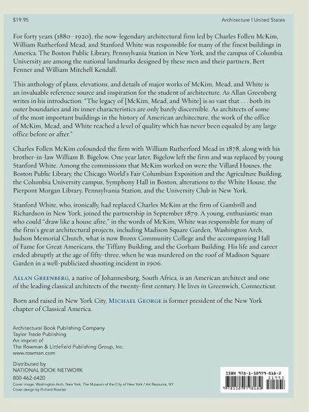 For nearly forty years the legendary firm led by Charles Follen McKim, William Rutherford Mead, and Stanford White was responsible for many of the finest buildings in America, including the Boston Public Library, Penn Station in New York, the Morgan Library, and the campus of Columbia University. This anthology of plans, elevations, and details of the major work of McKim, Mead, and White is an invaluable reference and inspiration for any student of architecture.