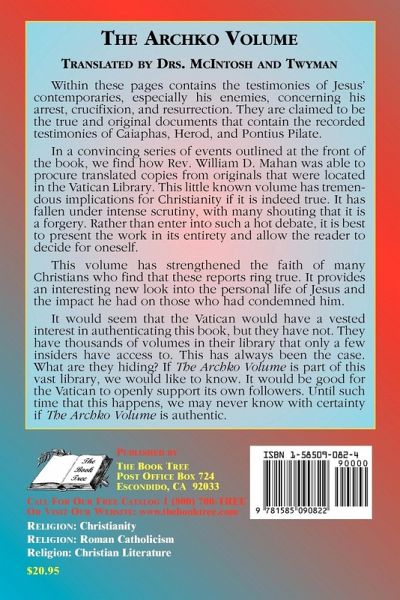 Historical document or a forgery? "The Archko Volume" contains the testimonies of Jesus' contemporaries, especially his enemies, concerning his arrest, crucifixion, and resurrection. Readers can decide for themselves if they truly contain the recorded testimonies of Caiaphas, Herod, and Pontius Pilate.