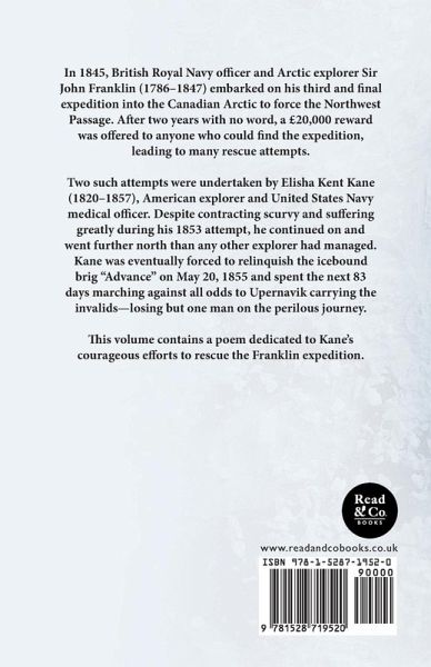 In 1845, British Royal Navy officer and Arctic explorer Sir John Franklin (1786¿1847) embarked on his third and final expedition into the Canadian Arctic to force the Northwest Passage. After two years with no word, a £20,000 reward was offered to anyone who could find the expedition, leading to many rescue attempts. Two such attempts were undertaken by Elisha Kent Kane (1820¿1857), American explorer and United States Navy medical officer. Despite contracting scurvy and suffering greatly during his 1853 attempt, he continued on and went further north than any other explorer had managed. Kane was eventually forced to relinquish the icebound brig ¿Advance¿ on May 20, 1855 and spent the next 83 days marching against all odds to Upernavik carrying the invalids¿losing but one man on the perilous journey. This volume contains a poem dedicated to Kane's courageous efforts to rescue the Franklin expedition, republished now by Ragged Hand in a brand new edition complete with an introductory biography of Sir John Franklin by John Know Loughton.