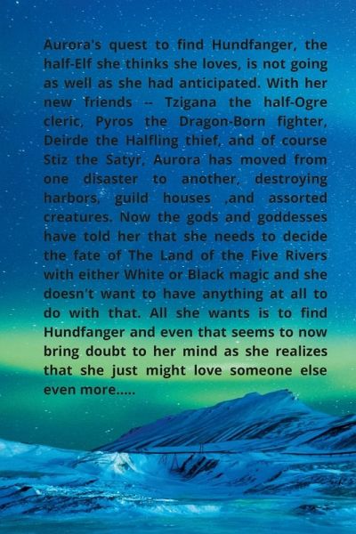 Aurora's quest to find Brother Hundfanger, the half-Elf she thinks she loves, is not going nearly as well as she anticipated. In fact, it's been one disaster after another. If she isn't fighting off Angelicus or Stone Giants, then she is accidentally destroying towns and cities as she moves Warm-side in her attempt to get to The Barrier Mountains and the woods of the Elves. With Tzigana the half-Ogre cleric, Pyros the Dragon-Born fighter, Deirdre the Halfling thief, and of course Stiz the Satyr, she is becoming more and more powerful as an Imbe and yet, she has no idea why she is so important. To add to her problems, the gods and goddesses have decreed that she needs to decide the fate of The Land of the Five Rivers and do it sooner rather than later and she wants no part of that whatsoever. And then there is the issue with her realization that she just might love someone else more than Brother Hundfanger and what does she do with that.....