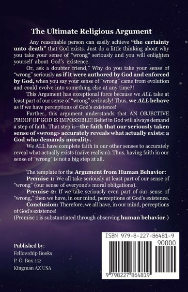The Argument from Human Behavior is the new strongest argument for God because it has superior epistemology and it understands that God's existence can never be an objective fact. It establishes that we (including martyrs) are able to achieve the "certainty unto death" that God exists through faith in our sense of "wrong" (our sense of everyone's moral obligations). This Argument reveals that when we take our sense of "wrong" seriously, we behave as if we have perceptions of God's existence in our minds! Without God, our sense of "wrong" would be constantly evolving and unenforced. Consequently, without God, our hard-to-live-by sense of "wrong" would be an absurdity, never qualified to be taken seriously! This essay does not argue that morality comes from God. It does not even argue God exists! This essay does argue that we all have perceptions of God's existence in our minds just as the Biblical God promises in Hebrews 10:16-This is the covenant I will make with them after those days, saith the Lord, I will put my laws into their hearts and in their minds will I write them. The template for the Argument from Human Behavior: Premise 1: If we take any part of our sense of "wrong" seriously, we have perceptions of God's existence in our minds. Premise 2: We all take at least part of our sense of "wrong" seriously. Conclusion: Therefore, we all have perceptions of God's existence in our minds. Corollary: Either an outlandish quirk of evolution put God's existence into everyone's mind or God Himself did it. Explanations: Premise 2: Everyone behaves as if some type of lying or some type of cheating is seriously "wrong." Premise 1: No one, besides God, has the authority to decree anything "wrong." And no one besides God has the power to enforce every "wrong" action. We would consider the rightness and wrongness everyone attaches to human actions nonsense if we did not assume, at least subconsciously, that God authored and enforced these normative valuations. Thus, in order not to esteem our sense of "wrong" an absurdity fabricated by evolution, we would need to have perceptions of God's existence in our minds! Nonetheless, we are free to deny that God actually exists because of the possibility that evolution (or something else) put God's existence into everyone's mind. Even so, everyone who takes any part of his or her sense of "wrong" seriously behaves as if God exists. Outside mathematics and in spite of the problem of induction, we also take a step of faith when we discover scientific facts! The problem of induction is this: No matter how many times a scientific experiment gives the same result, it is not a logical necessity that the next result will be the same. How do we "know," for example, the next slice of bread will nourish us, when it is not a logical necessity for it to do so?! We just have faith that the next result will be the same. Therefore, every scientific fact we have obtained through previous experiences depends on at least one step of faith! We all take hundreds of steps of faith every day when we trust our eyes, other senses and inductive reasoning to accurately reveal reality. Accordingly, it would be highly unreasonable not to take a step of faith and trust that our sense of "wrong" accurately reveals what actually exists-God. Do you really think there is any chance at all your sense of "wrong" is an absurd fabrication?! Know thyself. Think it over.
