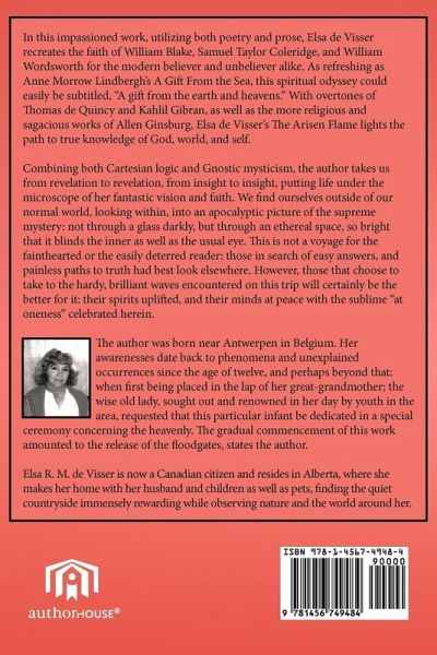 In this impassioned work, utilizing both poetry and prose, Elsa de Visser recreates the faith of William Blake, Samuel Taylor Coleridge, and William Wordsworth for the modern believer and unbeliever alike. As refreshing as Anne Morrow Lindbergh's A Gift From the Sea, this spiritual odyssey could easily be subtitled, "A gift from the earth and heavens." With overtones of Thomas de Quincy and Kahlil Gibran, as well as the more religious and sagacious works of Allen Ginsburg, Elsa de Visser's The Arisen Flame lights the path to true knowledge of God, world, and self. Combining both Cartesian logic and Gnostic mysticism, the author takes us from revelation to revelation, from insight to insight, putting life under the microscope of her fantastic vision and faith. We find ourselves outside of our normal world, looking within, into an apocalyptic picture of the supreme mystery: not through a glass darkly, but through an ethereal space, so bright that it blinds the inner as well as the usual eye. This is not a voyage for the fainthearted or the easily deterred reader: those in search of easy answers, and painless paths to truth had best look elsewhere. However, those that choose to take to the hardy, brilliant waves encountered on this trip will certainly be the better for it: their spirits uplifted, and their minds at peace with the sublime "at oneness" celebrated herein.