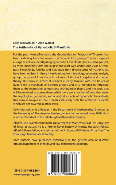 From the reviews: "In this book Machlachlan and Reid give a comprehensive treatment of hyperbolic 3-manifolds and Kleinian groups from the viewpoint of algebraic number theory. ... Throughout the book, Machlachlan and Reid use examples to motivate and illustrate the ideas they develop. ... This book is a welcome addition to the literature on Kleinian groups and hyperbolic geometry. It is both an accessible introduction to the number theoretic side of the field and a convenient source of reference material for the expert." (J. R. Parker, Proceedings of the Edinburgh Mathematical Society, Issue 48, 2005) "This book is aimed at ... exposing readers ... to the specific techniques from algebra and number theory needed to effectively study arithmetic manifolds and orbifolds. ... The list of references is quite extensive, but even more useful are the Further Reading sections ... which comprise a carefully annotated bibliography of the field. This book fills a real void in the literature, providing working topologists and graduate students with an accessible introduction to the useful and beautiful world of arithmetic hyperbolic 3-manifolds and orbifolds." (Kerry N. Jones, Mathematical Reviews, 2004 i) "The book gives a comprehensive introduction into the theory of quaternion algebras and its orders, deals with trace fields for Kleinian groups, a notion which allows us to determine the associated number field and quaternion algebra. ... The book is well written and is a substantial addition to the literature. It provides a suitable introduction into a deep area of research still under development." (J. Schwermer, Monatshefte für Mathematik, Vol. 145 (4), 2005) "This is a book of great importance on the theory of hyperbolic manifolds (and Kleinian groups) since it is the first to provide a complete, precise, clearly-written and self-contained exposition of the arithmetic aspects of the theory. For this, the book fills a void in the mathematics literature concerning hyperbolic geometry. The authors are two of the most fine mathematicians in the subject, and have made fundamental and beautiful contributions to the material included. ... the reviewer highly recommends this beautiful book ... ." (Alberto Cavicchioli, Zentralblatt MATH, Vol. 1025, 2003) "This book is aimed at readers already familiar with the basics of hyperbolic 3-manifolds or Kleinian groups, and it is intended to introduce them to the interesting connections with number theory and the tools that will be required to pursue them. While there are a number of texts that cover the topological, geometric, and analytical aspects of hyperbolic 3-manifolds, this book is unique in that it deals exclusively with the arithmetic aspects, which are not covered in other texts." (L'ENSEIGNEMENT MATHEMATIQUE, Vol. 49, (1-2), 2003)