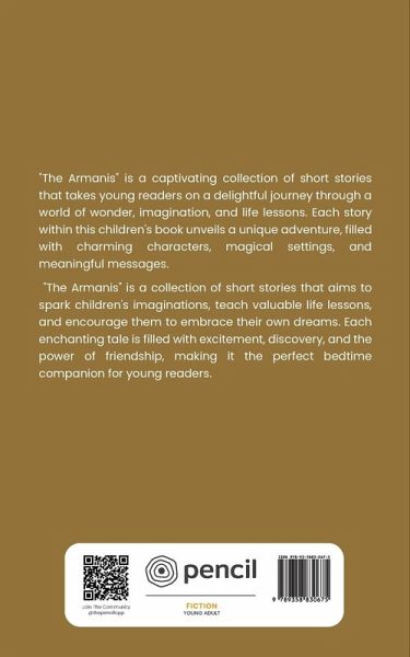 ""The Armanis"" is a captivating collection of short stories that takes young readers on a delightful journey through a world of wonder, imagination, and life lessons. Each story within this children's book unveils a unique adventure, filled with charming characters, magical settings, and meaningful messages. ""The Armanis"" is a collection of short stories that aims to spark children's imaginations, teach valuable life lessons, and encourage them to embrace their own dreams. Each enchanting tale is filled with excitement, discovery, and the power of friendship, making it the perfect bedtime companion for young readers.