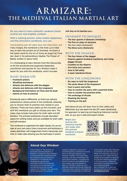 Armizare: the Medieval Italian Martial Art Do you want to learn authentic medieval Italian martial arts and knightly combat? With a training partner, some simple equipment, and this innovative workbook, you can. Incorporating over 40 video clips, text instruction, and many images, this workbook is the most up-to-date way to learn the ancient art of Armizare. Armizare is the Italian word for the Art of Arms, as taught by Fiore dei Liberi in his extraordinary treatise The Flower of Battle, written in about 1400. It is challenging to learn directly from the manuscript, so let the acclaimed and respected researcher, practitioner and teacher Dr. Guy Windsor make it easier for you with this workbook, which includes: Basic warm-ups Footwork actions Wrestling techniques Attacks and defences with the dagger Attacks and defences with the longsword Background information on Fiore and his book Advice on how to practice Everybody learns differently, so there are options presented at various points in the workbook, allowing you to choose what to practise next, based on your interests. There are many paths up the mountain, and with this workbook you get to choose your own. The video clips include instruction for both right and left handers. The printed workbooks include abundant space for writing notes, and are available for both right and left-handers. The workbook is organised into eight classes, for you to take at your own pace. Every movement and technique is clearly described, with images from Fiore's manuscript, and links to video clips showing you the technique in action. Join Guy as he teaches you... Unarmed techniques The four guards of abrazare (wrestling) The first six plays of abrazare The four steps (footwork) The three turns (footwork) With the Dagger The four blows of the dagger Disarms against forehand, backhand, and rising dagger thrusts Counters to the disarms Arm locks and counters How to fall safely A basic takedown/throw With the Longsword Six ways to hold the longsword The seven blows of the longsword How to parry and strike How to counter the parry with a pommel strike How to counter the pommel strike The exchange of thrusts Breaking the thrusts Training on the pell And above all you will learn how to train safely and effectively. Guy has spent the last 20+ years developing his approach to learning and teaching historical martial arts, so you are in safe and expert hands. Begin your journey into historical martial arts today with this ground-breaking Armizare workbook.