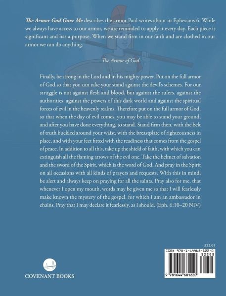 The Armor God Gave Me describes the armor Paul writes about in Ephesians 6. While we always have access to our armor, we are reminded to apply it every day. Each piece is significant and has a purpose. When we stand firm in our faith and are clothed in our armor we can do anything. The Armor of God Finally, be strong in the Lord and in his mighty power. Put on the full armor of God so that you can take your stand against the devil's schemes. For our struggle is not against flesh and blood, but against the rulers, against the authorities, against the powers of this dark world and against the spiritual forces of evil in the heavenly realms. Therefore put on the full armor of God, so that when the day of evil comes, you may be able to stand your ground, and after you have done everything, to stand. Stand firm then, with the belt of truth buckled around your waist, with the breastplate of righteousness in place, and with your feet fitted with the readiness that comes from the gospel of peace. In addition to all this, take up the shield of faith, with which you can extinguish all the flaming arrows of the evil one. Take the helmet of salvation and the sword of the Spirit, which is the word of God. And pray in the Spirit on all occasions with all kinds of prayers and requests. With this in mind, be alert and always keep on praying for all the saints. Pray also for me, that whenever I open my mouth, words may be given me so that I will fearlessly make known the mystery of the gospel, for which I am an ambassador in chains. Pray that I may declare it fearlessly, as I should. (Eph. 6:10-20 NIV)