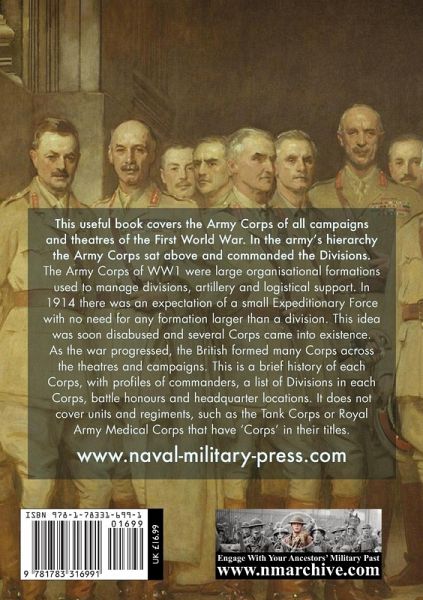 This useful book covers the Army Corps of all campaigns and theatres of the First World War. In the army’s hierarchy the Army Corps sat above and commanded the Divisions. The Army Corps of WW1 were large organisational formations used to manage divisions, artillery and logistical support. In 1914 there was an expectation of a small Expeditionary Force with no need for any formation larger than a division. This idea was soon disabused and several Corps came into existence. As the war progressed, the British formed many Corps across the theatres and campaigns. This is a brief history of each Corps, with profiles of commanders, a list of Divisions in each Corps, battle honours and headquarter locations. It does not cover units and regiments, such as the Tank Corps or Royal Army Medical Corps that have ‘Corps’in their titles.