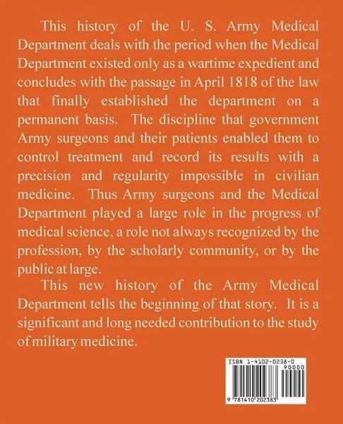 This history of the U. S. Army Medical Department deals with the period when the Medical Department existed only as a wartime expedient and concludes with the passage in April 1818 of the law that finally established the department on a permanent basis. The discipline that government Army surgeons and their patients enabled them to control treatment and record its results with a precision and regularity impossible in civilian medicine. Thus Army surgeons and the Medical Department played a large role in the progress of medical science, a role not always recognized by the profession, by the scholarly community, or by the public at large. This new history of the Army Medical Department tells the beginning of that story. It is a significant and long needed contribution to the study of military medicine.