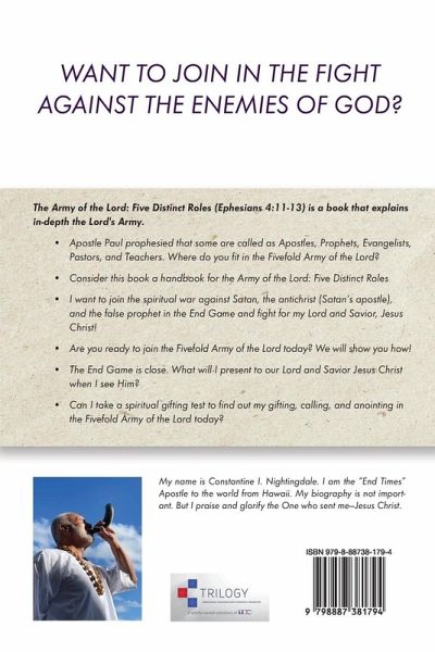 WANT TO JOIN IN THE FIGHT AGAINST THE ENEMIES OF GOD? ¿¿The Army of the Lord: Five Distinct Roles (Ephesians 4:11-13) is a book that explains in-depth the Lord's Army.Apostle Paul prophesied that some are called as Apostles, Prophets, Evangelists, Pastors, and Teachers. Where do you fit in the Fivefold Army of the Lord? Consider this book a handbook for the Army of the Lord: Five Distinct Roles I want to join the spiritual war against Satan, the antichrist (Satan's apostle), and the false prophet in the End Game and fight for my Lord and Savior, Jesus Christ! Are you ready to join the Fivefold Army of the Lord today? We will show you how! The End Game is close. What will I present to our Lord and Savior Jesus Christ when I see Him? Can I take a spiritual gifting test to find out my gifting, calling, and anointing in the Fivefold Army of the Lord today?