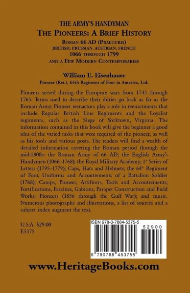 Pioneers served during the European wars from 1745 through 1765. Terms used to describe their duties go back as far as the Roman Army. Pioneer reenactors play a role in reenactments that include Regular British Line Regiments and the Loyalist regiments, such as the Siege of Yorktown, Virginia. The information contained in this book will give the beginner a good idea of the varied tasks that were required of the pioneer, as well as his tools and various posts. The readers will find a wealth of detailed information covering the Roman period through the mid-1800s: the Roman Army of 66 AD; the English Army's Handymen (1066-1768); the Royal Military Academy; 1st Series of Letters (1795-1779); Caps, Hats and Helmets; the 64th Regiment of Foot, Uniforms and Accoutrements of a Battalion Soldier (1768); Camps, Pioneer, Artificers, Tools and Accoutrements; Fortifications, Fascines, Gabions, Parapet Construction and Field Works; Pioneers (1856 through the Gulf War); and music. Numerous photographs and illustrations, a list of sources and a subject index augment the text.