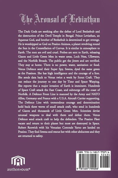 The Dark Gods are seething after the defeat of Lord Beelzebub and the destruction of the Devil Temple in Bengal. Prince Leviathan, an Aqueous God, and brother of Beelzebub is determined to get revenge. He is worshipped as God on Prasino Animos, a planet revolving round the Sun in the Constellation of Corvus. It is similar in atmosphere to Earth. The men are evil and cruel. Probes are sent to Earth, releasing Giants and Little Green Men in water areas, Loch Ness, Ullswater, and the Norfolk Broads. The public get the jitters and are terrified. They stay at home. There is no power, water, sanitation or food. Venus Defence send their Super Spy, Sreena, dyed the same green as the Prasinos. She has high intelligence and the courage of a lion. She sends data back to Venus twice a week by Scout Craft. They can reduce the journey to one day by Time and Space Warping. She reports that a major invasion of Earth is imminent. Hundreds of Space Craft attack the East Coast, and submerge off the coast of Norfolk. A Defence Front Line is manned by the Army and NATO Allies, Germany and France with a U.S.A. Aircraft Carrier supporting. The Defence Line with tremendous courage and determination hold back three waves of small attack craft, who send in hundreds of Giants and thousands of Little Green Men. Scientists devise unusual weapons to deal with them and defeat them. Venus Defence send attack craft to help the defenders. The Prasino Fleet vacate and return to their planet but most are destroyed in Space. Robert Renwick with his Venusian Comrade Yarno are landed on Prasino. They find Sreena and rescue her with other abductees and they are returned to safety.