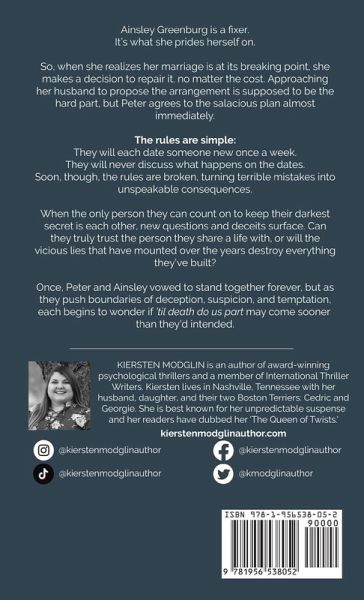 The arrangement was just meant to fix their marriage. No one was supposed to get hurt. But when the rules of this open marriage are broken, the consequences are sinister. Ainsley Greenburg is a fixer. It's what she prides herself on. So, when she realizes her marriage is at its breaking point, she makes a decision to repair it, no matter the cost. Approaching her husband to propose the arrangement is supposed to be the hard part, but Peter agrees to the salacious plan almost immediately. The rules are simple:They will each date someone new once a week. They will never discuss what happens on the dates. Soon, though, the rules are broken, turning terrible mistakes into unspeakable consequences. When the only person they can count on to keep their darkest secret is each other, new questions and deceits surface. Can they truly trust the person they share a life with, or will the vicious lies that have mounted over the years destroy everything they've built? Once, Peter and Ainsley vowed to stand together forever, but as they push boundaries of deception, suspicion, and temptation, each begins to wonder if 'til death do us part may come sooner than they'd intended.