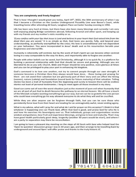 The author has an MA in Mathematics from St. John's College, Cambridge, where he first relapsed into mental illness that has affected his life, but he claims 'success' in being a survivor. He became a Christian at age 26 at All Souls, Langham Place where he continued to be a member for over ten years. and worked successfully in the city for a while having gained a distinction in Actuarial Science at City University. Watching Arsenal, playing Bridge, and travelling have kept his interest and been helpful to his health as has gaining some insight into mental illness. Writing has also been therapeutic in itself as well as in receiving encouragement from others. For more information see https://www.facebook.com/afcNigel/ and https://www.linkedin.com/in/nigel-bird-09b53725