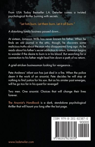 From USA Today Bestseller L.A. Detwiler comes a twisted psychological thriller burning with secrets. "Let him burn. Let them burn. Let it all burn." A disturbing family business passed down… At sixteen, Jameson Wills has never known his father. When he finds an old journal in the attic, though, he discovers some malicious truths about the man who disappeared long ago. As he reads about his father's secret addiction to arson, Jameson begins to wonder if the desire to burn is in his blood. But searching for a connection to his father might lead him down a path of no return. A grief-stricken businessman looking for vengeance… Pete Andrews' infant son has just died in a fire. When the police deem it the work of an arsonist, Pete decides he will stop at nothing to find justice for his son. But as his sinister past emerges, will he go too far in his quest for revenge? Two men. One arsonist. Choices that will change their lives forever. The Arsonist's Handbook is a dark, standalone psychological thriller that will haunt you long after the last page.