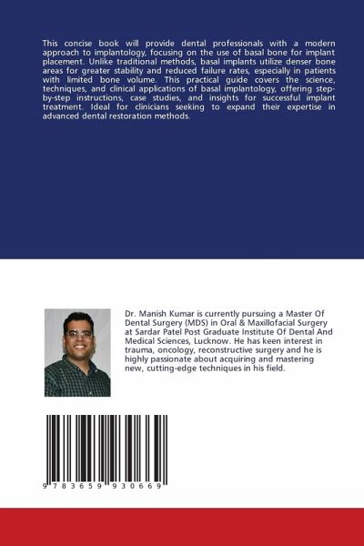 This concise book will provide dental professionals with a modern approach to implantology, focusing on the use of basal bone for implant placement. Unlike traditional methods, basal implants utilize denser bone areas for greater stability and reduced failure rates, especially in patients with limited bone volume. This practical guide covers the science, techniques, and clinical applications of basal implantology, offering step-by-step instructions, case studies, and insights for successful implant treatment. Ideal for clinicians seeking to expand their expertise in advanced dental restoration methods.