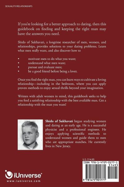 If you're looking for a better approach to dating, then this guidebook on finding and keeping the right man may have the answers you need. Shido of Sukhavati, a longtime researcher of men, women, and relationships, provides solutions to your dating problems. Learn what men really want, and also discover how to ¿ motivate men to do what you want; ¿ understand what men want; ¿ pursue and evaluate men; ¿ be a good friend before being a lover. Once you find the right man, you can learn ways to cultivate a loving relationship-including in the bedroom, where you can apply proven methods to enjoy sexual thrills beyond your imagination. Written with adult women in mind, this guidebook seeks to help you find a satisfying relationship with the best available man. Get a relationship with the man you want!
