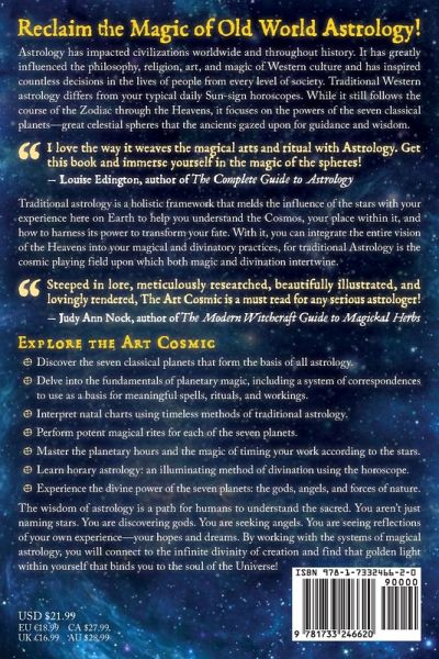 Reclaim the Magic of Old World Astrology! Astrology has impacted civilizations worldwide and throughout history. It has greatly influenced the philosophy, religion, art, and magic of Western culture and has inspired countless decisions in the lives of people from every level of society. Traditional Western astrology differs from your typical daily Sun-sign horoscopes. While it still follows the course of the Zodiac through the Heavens, it focuses on the powers of the seven classical planets-great celestial spheres that the ancients gazed upon for guidance and wisdom. "I love the way it weaves the magical arts and ritual with Astrology. Get this book and immerse yourself in the magic of the spheres!" - Louise Edington, author of The Complete Guide to Astrology Traditional astrology is a holistic framework that melds the influence of the stars with your experience here on Earth to help you understand the Cosmos, your place within it, and how to harness its power to transform your fate. With it, you can integrate the entire vision of the Heavens into your magical and divinatory practices, for traditional Astrology is the cosmic playing field upon which both magic and divination intertwine. Steeped in lore, meticulously researched, beautifully illustrated, and lovingly rendered, The Art Cosmic is a must read for any serious astrologer! - Judy Ann Nock, author of The Modern Witchcraft Guide to Magickal Herbs Explore the Art CosmicDiscover the seven classical planets that form the basis of all astrology. Delve into the fundamentals of planetary magic, including a system of correspondences to use as a basis for meaningful spells, rituals, and workings. Interpret natal charts using timeless methods of traditional astrology. Perform potent magical rites for each of the seven planets. Master the planetary hours and the magic of timing your work according to the stars. Learn horary astrology: an illuminating method of divination using the horoscope. Experience the divine power of the seven planets: the gods, angels, and forces of nature. The wisdom of astrology is a path for humans to understand the sacred. You aren't just naming stars. You are discovering gods. You are seeking angels. You are seeing reflections of your own experience-your hopes and dreams. By working with the systems of magical astrology, you will connect to the infinite divinity of creation and find that golden light within yourself that binds you to the soul of the Universe!