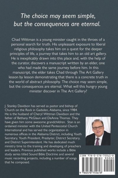 Chad Wittman is a young minister caught in the throes of a personal search for truth. His unpleasant exposure to liberal religious philosophy takes him on a quest for the deeper principles of life, a journey that leads him to an old art gallery. He is inexplicably drawn into this place, and, with the help of the curator, discovers a manuscript written by an elder, one who had made the same journey before him. In this manuscript, the elder takes Chad through The Art Gallery lesson by lesson, demonstrating that there is a concrete truth in the world of abstract philosophy. The choice may seem simple, but the consequences are eternal. What will this hungry young minister discover in The Art Gallery?