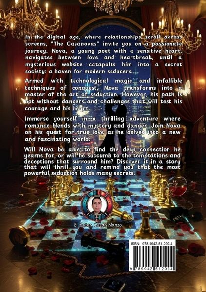 In the digital age, where relationships slip through screens, "The Casanovas" invite you on an exciting journey. Nova, a young poet with a sensitive heart, navigates between love and heartbreak until a mysterious website catapults him into a secret society: a refuge of modern seducers. Armed with technological magic and infallible conquest techniques, Nova transforms into a master of the art of seduction. However, his path is not without dangers and challenges that will test his courage and heart. Dive into a thrilling adventure where romance mixes with mystery and danger. Join Nova on his quest for true love as he ventures into a new and fascinating world. Will Nova find the deep connection he longs for or succumb to the temptations and deceptions surrounding him? Discover it in a story that will make you vibrate and remind you that the most powerful seduction has many secrets.