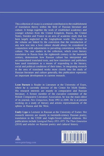 This collection of essays is a seminal contribution to the establishment of translation theory within the field of Russian literature and culture. It brings together the work of established academics and younger scholars from the United Kingdom, Russia, the United States, Sweden and France in an area of academic study that has been largely neglected in the Anglophone world. The essays in the volume are linked by the conviction that the introduction of any new text into a host culture should always be considered in conjunction with adjustments to prevailing conventions within that culture. The case studies in the collection, which cover literary translation in Russia from the eighteenth century to the twentieth century, demonstrate how Russian culture has interpreted and accommodated translated texts, and how translators and publishers have used translation as a means of responding to the literary, social and political conditions of their times. In integrating research in the areaof translated works more closely into the study of Russian literature and culture generally, this publication represents an important development in current research.