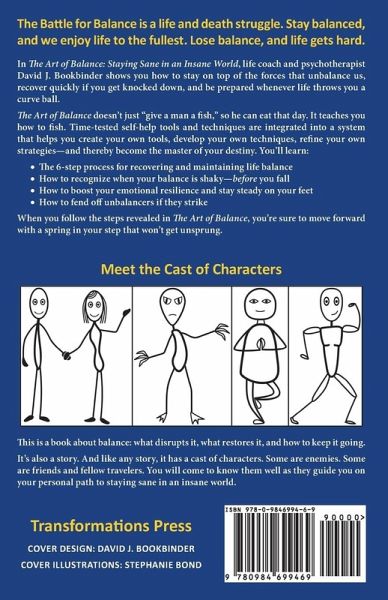 Stressed out? Feeling like life is harder than it should be? Then you've come to the right place. The Battle for Balance is a life and death struggle. Stay balanced, and we enjoy life to the fullest. Lose balance, and life gets hard. In The Art of Balance: Staying Sane in an Insane World, life coach and psychotherapist David J. Bookbinder shows you how to stay on top of the forces that unbalance us, recover quickly if you get knocked down, and be prepared whenever life throws you a curve ball. The Art of Balance doesn't just "give a man a fish," so he can eat that day. It teaches you how to fish. Time-tested self-help tools and techniques are integrated into a system that helps you create your own tools, develop your own techniques, refine your own strategies-and thereby become the master of your destiny. You'll learn: The 6-step process for recovering and maintaining life balance How to recognize when your balance is shaky-before you fall How to boost your emotional resilience and stay steady on your feet How to fend off unbalancers if they strike When you follow the steps revealed in The Art of Balance, you're sure to move forward with a spring in your step that won't get unsprung. More about The Art of Balance six-step system The six-step system you'll learn in The Art of Balance is flexible and adaptable. You can use it to handle both chronic problems that take us down a little at a time and sudden events that knock us flat. Here are a few examples. You'll learn how to stay centered when life hits you hard: Romantic breakup Job loss Financial crisis Illness or accident Loss of someone close And how to tackle chronic stresses: Work/Life imbalance Anxiety Depression Medical issues Addictions It's a system you can adapt not only to the issues you face today, but also to the unknowns down the road, so you can move confidently into your future.