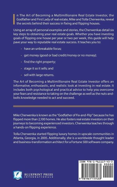 In The Art of Becoming a Multimillionaire Real Estate Investor, the Godfather and First Lady of real estate, Mike and Tolla Cherwenka, reveal the secrets behind their success in fixing and flipping houses. Using an array of personal examples and stories, the Cherwenkas detail six key steps to obtaining your real estate goals. Whether you have investing goals of flipping one house per year or two per week, this guide will help pave your way to reputable real estate success. It teaches you to: have an unbreakable focus; get money (good or bad credit/money or no money); find the right property; stage it so it sells; and sell with large returns. The Art of Becoming a Multimillionaire Real Estate Investor offers an informative, enthusiastic, and realistic look at investing in real estate. It includes both psychological and practical advice to help you overcome your fears and resistance to taking on the challenge as well as the nuts-and-bolts knowledge needed to act and succeed. Mike Cherwenka is known as the "Godfather of Fix-and-Flip" because he has flipped more than 2,100 homes. He also fosters real estate investors on their journeys to becoming experienced investors. Cherwenka teaches through a hands-on flipping experience. Tolla Cherwenka started flipping luxury homes in upscale communities in Atlanta, Georgia, in 2005. Additionally, she is a worldwide thought leader and business-transformation architect for a Fortune 500 software company.