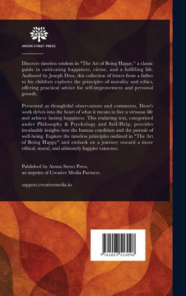 Discover timeless wisdom in "The Art of Being Happy," a classic guide to cultivating happiness, virtue, and a fulfilling life. Authored by Joseph Droz, this collection of letters from a father to his children explores the principles of morality and ethics, offering practical advice for self-improvement and personal growth. Presented as thoughtful observations and comments, Droz's work delves into the heart of what it means to live a virtuous life and achieve lasting happiness. This enduring text, categorized under Philosophy & Psychology and Self-Help, provides invaluable insights into the human condition and the pursuit of well-being. Explore the timeless principles outlined in "The Art of Being Happy" and embark on a journey toward a more ethical, moral, and ultimately happier existence. This work has been selected by scholars as being culturally important, and is part of the knowledge base of civilization as we know it. This work is in the public domain in the United States of America, and possibly other nations. Within the United States, you may freely copy and distribute this work, as no entity (individual or corporate) has a copyright on the body of the work. Scholars believe, and we concur, that this work is important enough to be preserved, reproduced, and made generally available to the public. We appreciate your support of the preservation process, and thank you for being an important part of keeping this knowledge alive and relevant.