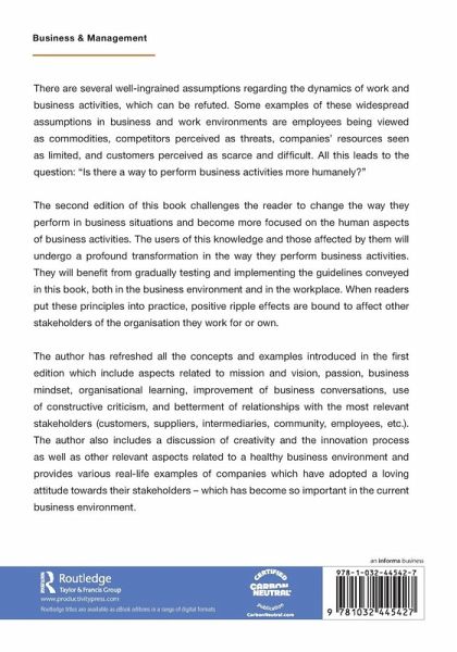 The author has refreshed all the concepts and examples introduced in the first edition which include aspects related to mission and vision, passion, business mindset, organisational learning, improvement of business conversations, use of constructive criticism, and betterment of relationships with the most relevant stakeholders (customers, suppliers, intermediaries, community, employees, etc.). The author also includes a discussion of creativity and the innovation process as well as other relevant aspects related to a healthy business environment and provides various real-life examples of companies which have adopted a loving attitude towards their stakeholders - which has become so important in the current business environment.
