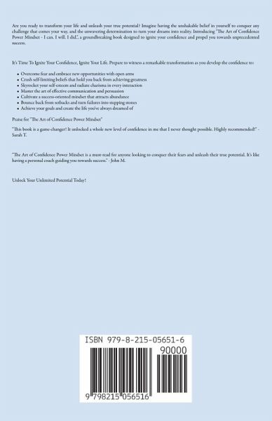 Unlock the Power of Confidence with "The Art of Confidence Power Mindset - I can. I will. I did." Are you ready to transform your life and unleash your true potential? Imagine having the unshakable belief in yourself to conquer any challenge that comes your way, and the unwavering determination to turn your dreams into reality. Introducing "The Art of Confidence Power Mindset - I can. I will. I did.", a groundbreaking book designed to ignite your confidence and propel you towards unprecedented success. It's Time To Ignite Your Confidence, Ignite Your Life In this captivating book, we dive deep into the core principles of building unbreakable confidence mindset. No matter where you are on your journey, this book will equip you with the mindset, tools, and strategies to break free from self-doubt and embrace your true worth. Prepare to witness a remarkable transformation as you develop the confidence to: Overcome fear and embrace new opportunities with open arms Crush self-limiting beliefs that hold you back from achieving greatness Skyrocket your self-esteem and radiate charisma in every interaction Master the art of effective communication and persuasion Cultivate a success-oriented mindset that attracts abundance Bounce back from setbacks and turn failures into stepping stones Achieve your goals and create the life you've always dreamed of What Sets "The Confidence Power Mindset" Apart? Unlike other self-help books that offer temporary motivation, "The Confidence Power Mindset - I can. I will. I did." provides you with the tools and actionable techniques needed to make lasting change. Drawing on the latest research in psychology, personal development, and success principles, this book presents a step-by-step roadmap to empower you to become the best version of yourself. Praise for "The Art of Confidence Power Mindset" "This book is a game-changer! It unlocked a whole new level of confidence in me that I never thought possible. Highly recommended!" - Sarah T. "The Art of Confidence Power Mindset is a must-read for anyone looking to conquer their fears and unleash their true potential. It's like having a personal coach guiding you towards success." - John M. Unlock Your Unlimited Potential Today! Don't let self-doubt and fear hold you back from the life you deserve. Embrace the power of confidence and take control of your destiny. Order your copy of "The Confidence Power Mindset - I can. I will. I did." now and embark on a life-changing journey towards becoming the confident, unstoppable force you were born to be. Tap into your limitless potential. Get your copy of "The Art of Confidence Power Mindset - I can. I will. I did." today!
