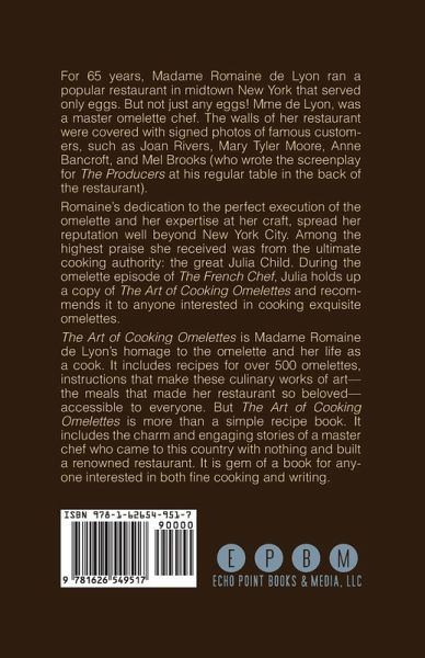 For 65 years, Madame Romaine de Lyon ran a popular restaurant in midtown New York that served only eggs. But not just any eggs! Mme de Lyon, was a master omelette chef. The walls of her restaurant were covered with signed photos of famous customers, such as Joan Rivers, Mary Tyler Moore, Anne Bancroft, and Mel Brooks (who wrote the screenplay for The Producers at his regular table in the back of the restaurant). Romaine's dedication to the perfect execution of the omelette and her expertise at her craft, spread her reputation well beyond New York City. Among the highest praise she received was from the ultimate cooking authority: the great Julia Child. During the omelette episode of The French Chef, Julia holds up a copy of The Art of Cooking Omelettes and recommends it to anyone interested in cooking exquisite omelettes. The Art of Cooking Omelettes is Madame Romaine de Lyon's homage to the omelette and her life as a cook. It includes recipes for over 500 omelettes instructions that make these culinary works of art-the meals that made her restaurant so beloved-accessible to everyone. But The Art of Cooking Omelettes is more than a simple recipe book. It includes the charm and engaging stories of a master chef who came to this country with nothing an built a renowned restaurant. It is gem of a book for anyone interested in both fine cooking and writing.
