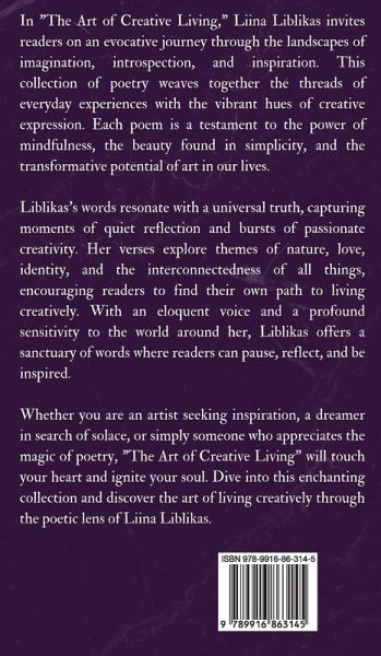 In "The Art of Creative Living," Liina Liblikas invites readers on an evocative journey through the landscapes of imagination, introspection, and inspiration. This collection of poetry weaves together the threads of everyday experiences with the vibrant hues of creative expression. Each poem is a testament to the power of mindfulness, the beauty found in simplicity, and the transformative potential of art in our lives. Liblikas's words resonate with a universal truth, capturing moments of quiet reflection and bursts of passionate creativity. Her verses explore themes of nature, love, identity, and the interconnectedness of all things, encouraging readers to find their own path to living creatively. With an eloquent voice and a profound sensitivity to the world around her, Liblikas offers a sanctuary of words where readers can pause, reflect, and be inspired. Whether you are an artist seeking inspiration, a dreamer in search of solace, or simply someone who appreciates the magic of poetry, "The Art of Creative Living" will touch your heart and ignite your soul. Dive into this enchanting collection and discover the art of living creatively through the poetic lens of Liina Liblikas. Copyright (c) 2024 Swan Charm Publishing