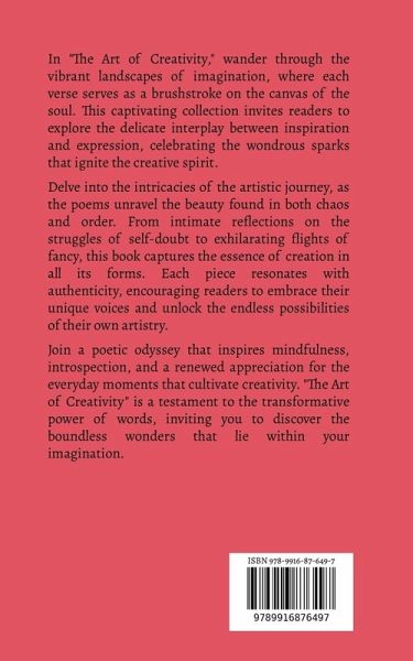 In "The Art of Creativity," wander through the vibrant landscapes of imagination, where each verse serves as a brushstroke on the canvas of the soul. This captivating collection invites readers to explore the delicate interplay between inspiration and expression, celebrating the wondrous sparks that ignite the creative spirit. Delve into the intricacies of the artistic journey, as the poems unravel the beauty found in both chaos and order. From intimate reflections on the struggles of self-doubt to exhilarating flights of fancy, this book captures the essence of creation in all its forms. Each piece resonates with authenticity, encouraging readers to embrace their unique voices and unlock the endless possibilities of their own artistry. Join a poetic odyssey that inspires mindfulness, introspection, and a renewed appreciation for the everyday moments that cultivate creativity. "The Art of Creativity" is a testament to the transformative power of words, inviting you to discover the boundless wonders that lie within your imagination.