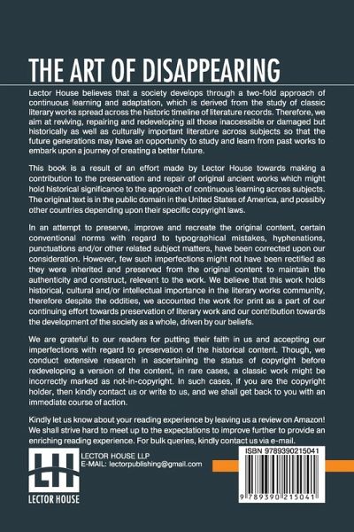 The Art Of Disappearing This book is a result of an effort made by us towards making a contribution to the preservation and repair of original classic literature. In an attempt to preserve, improve and recreate the original content, we have worked towards: 1. Type-setting & Reformatting: The complete work has been re-designed via professional layout, formatting and type-setting tools to re-create the same edition with rich typography, graphics, high quality images, and table elements, giving our readers the feel of holding a 'fresh and newly' reprinted and/or revised edition, as opposed to other scanned & printed (Optical Character Recognition - OCR) reproductions. 2. Correction of imperfections: As the work was re-created from the scratch, therefore, it was vetted to rectify certain conventional norms with regard to typographical mistakes, hyphenations, punctuations, blurred images, missing content/pages, and/or other related subject matters, upon our consideration. Every attempt was made to rectify the imperfections related to omitted constructs in the original edition via other references. However, a few of such imperfections which could not be rectified due to intentional\unintentional omission of content in the original edition, were inherited and preserved from the original work to maintain the authenticity and construct, relevant to the work. We believe that this work holds historical, cultural and/or intellectual importance in the literary works community, therefore despite the oddities, we accounted the work for print as a part of our continuing effort towards preservation of literary work and our contribution towards the development of the society as a whole, driven by our beliefs. We are grateful to our readers for putting their faith in us and accepting our imperfections with regard to preservation of the historical content. HAPPY READING!